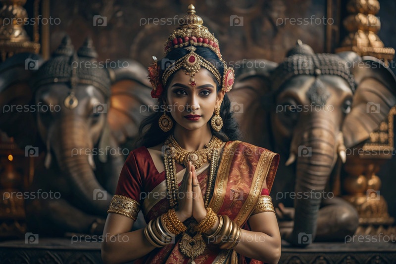 Красивая индийская девушка в традиционном национальном костюме, сари. со слонами. портрет символизирует традиции, культуру и красоту народа Индии