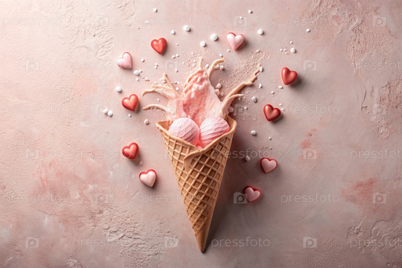 Сладкий десерт. Любовь к мороженому. Сердечно-образный конус мороженого с брызгами, сердцами и пятнами. Концепция Дня святого Валентина. Баннер, реклама