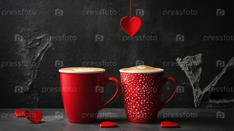 Концепция Дня святого Валентина для кафе и ресторанов красные чашки кофе латте с сердцами вокруг горячие напитки для влюбленных