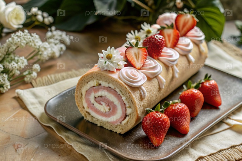 Швейцарская губка со клубникой, вкусный фруктовый и кремообразный десерт наполненный сливочным сыром, украшенный свежими ягодами