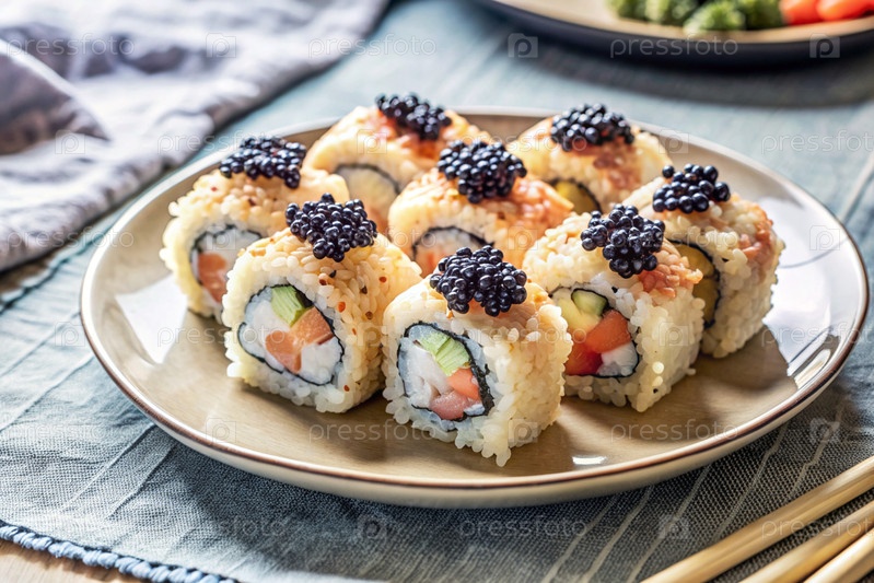 Японская еда. Суши-роллы Калифорния, Филадельфия с угорьем, красной икры и лососем. Концепция меню суши-бара