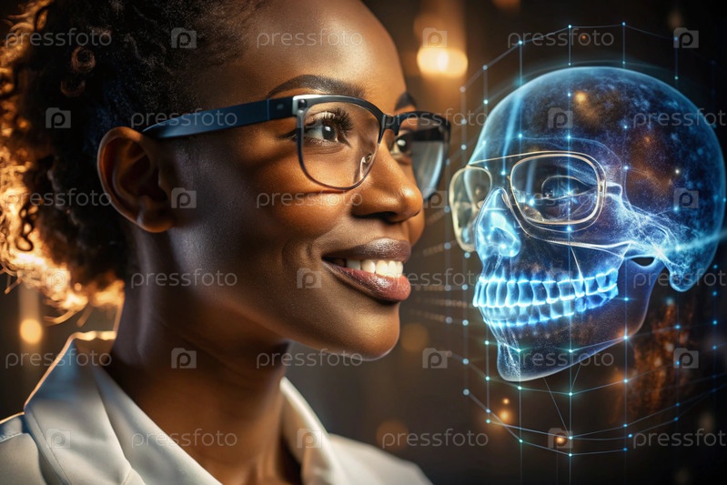 Новые технологии цифрового искусственного интеллекта в зубных протезах. Имплантаты. Чернокожая женщина-стоматолог с идеальной улыбкой и цифровой стоматологической графикой на виртуальном экране. Концепция здоровья зубов и ухода за зубами
