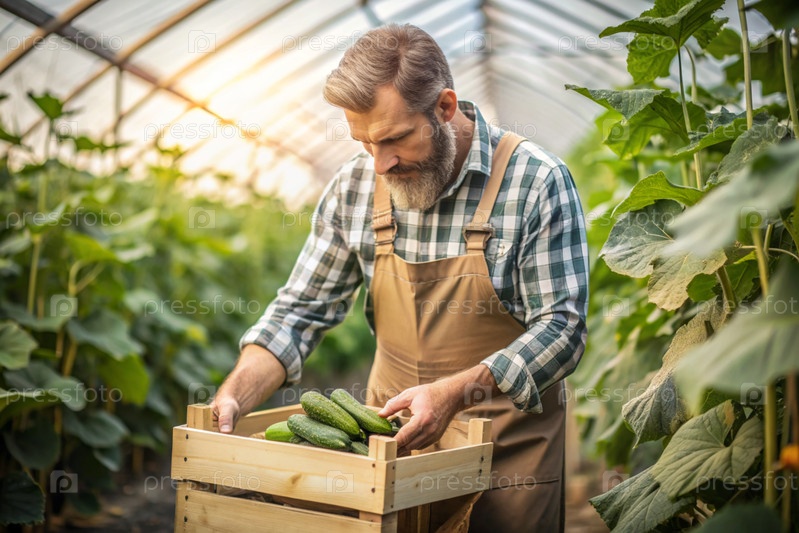 Сельскохозяйственная промышленность. деревянный ящик с огурцами в руках фермера-мужчины. садовник собирает богатый урожай в теплице
