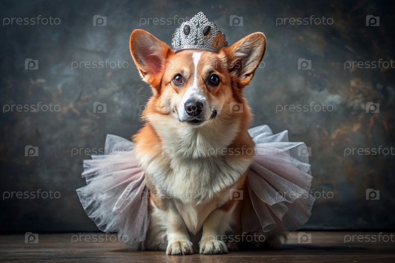 Красивый портрет симпатичной красной валлийской собаки Корги, одетой в розовое туту и с короной на голове