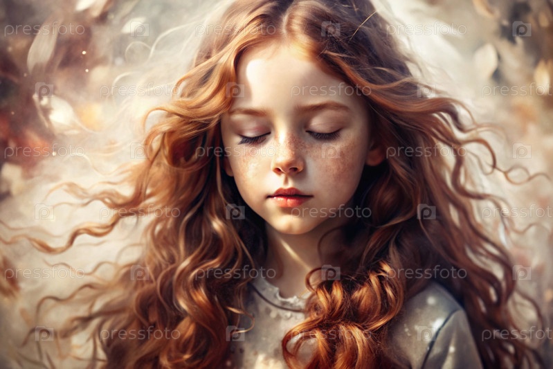 Портрет красивой маленькой рыжеволосой девочки с длинными волнистыми волосами и задумчивым взглядом.Власы развиваются и создают ощущение легкости и естественности