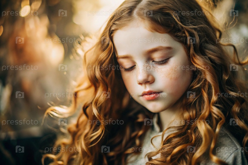 Портрет красивой маленькой рыжеволосой девочки с длинными волнистыми волосами и задумчивым взглядом.Власы развиваются и создают ощущение легкости и естественности