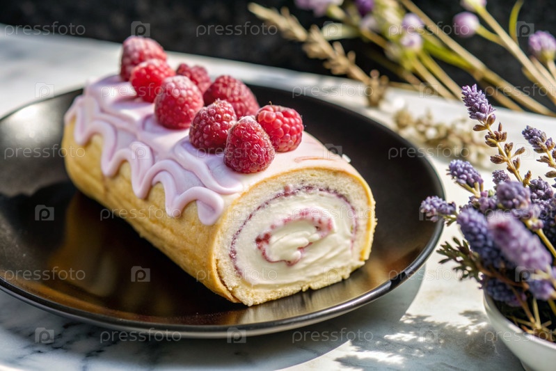 Швейцарская губка с малиной, вкусный фруктовый и сливочный десерт наполненный кремовым сыром, украшенный свежими малинами