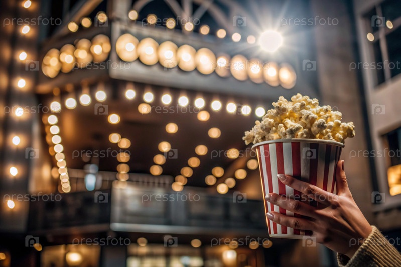 Красно-белый полосатый ящик с солеными попкорнами в руке на фоне светофоров кинотеатра
