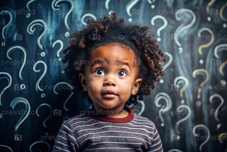 Развитие и образование детей. удивленная афроамериканская чернокожая девушка на темном фоне с вопросительными знаками. мозговой штурм, вопросы детей и концепция идеи