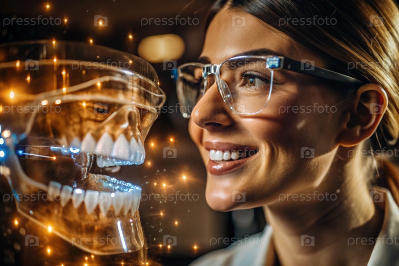 Новые технологии цифрового искусственного интеллекта в зубных протезах. Имплантаты. Женщина-стоматолог с идеальной улыбкой и цифровой графикой на виртуальном экране