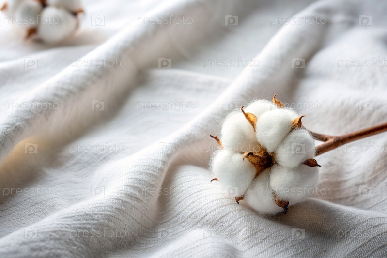 Текстильная промышленность. Хлопок. Хлопковый цветок на фоне белого хлопкового ткани. Место для текста