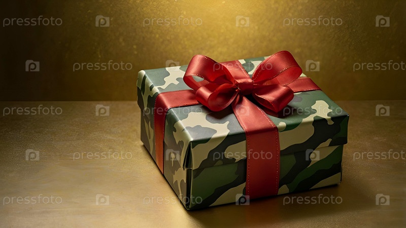Концепция Дня защитника Отечества 23 февраля.Подарок камуфляжной коробки с праздничной сатинной лентой лука на золотом фоне