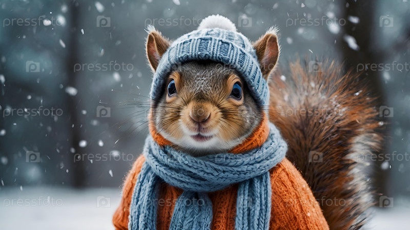 белка с большими щеками, одетая в уютную мягкую сине-оранжевую теплую одежду, шляпу и шарф на зимнюю тему