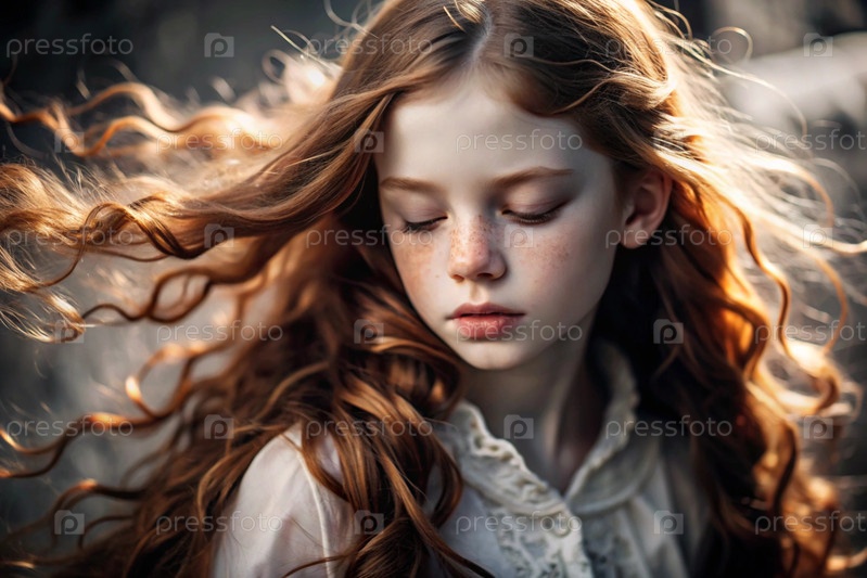 Портрет красивой маленькой рыжеволосой девочки с длинными волнистыми волосами и задумчивым взглядом.Власы развиваются и создают ощущение легкости и естественности