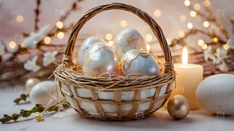 Нежные пасхальные яйца в жемчужной корзине и нежные цветы на пастельно-водном фоне