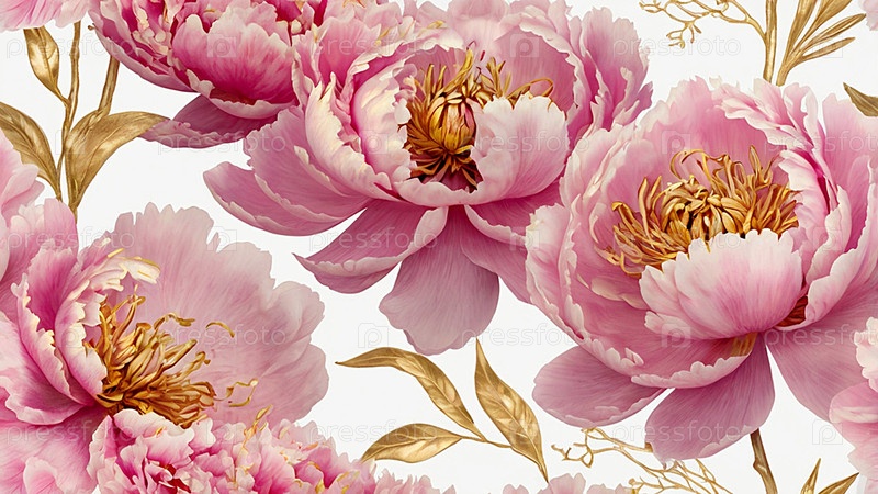Пеони - это летние ароматные цветы. Красивый цветочный фон с красивым эффектом боке. Нежные розовые бутончики пеонии на белом акварельном фоне со золотыми венами