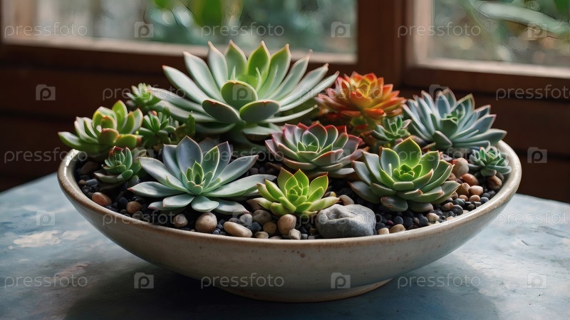 Группа миниатюрных сочных цветов в керамическом горшке в форме дома на подоконнике. Закрывая зеленые вершины растения эчеверия. Цветущие комнатные растения. Суккуленты