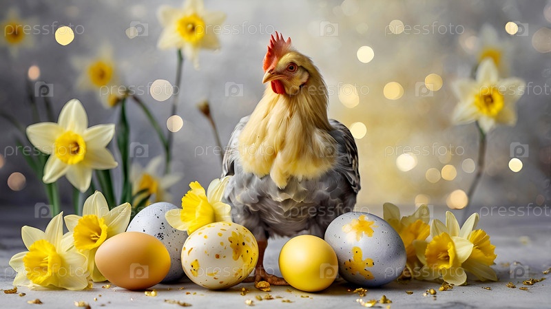 Нежные пасхальные яйца, желтые куры, цветы цыплят и нарцисс на фоне пастельного акварели с нежными венами