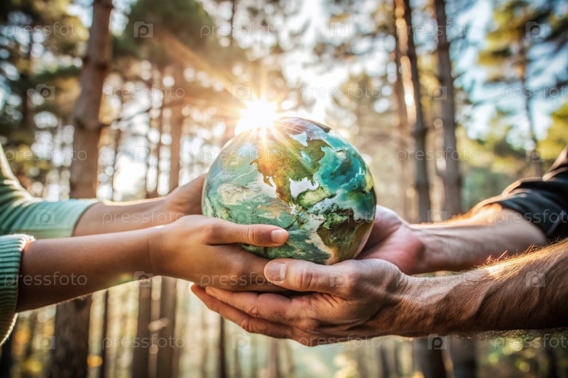 Мужчины и женщины держат маленькую модель Земли. Возрождение. Забота о планете, экологическое сознание и единство людей в сохранении природы