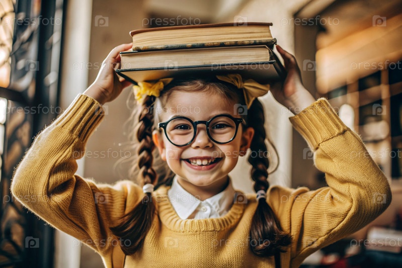 Красивая девочка с очками и книгами на голове.Ребенок впервые ходит в школу.Дети на свежем воздухе.Возвращение к школе