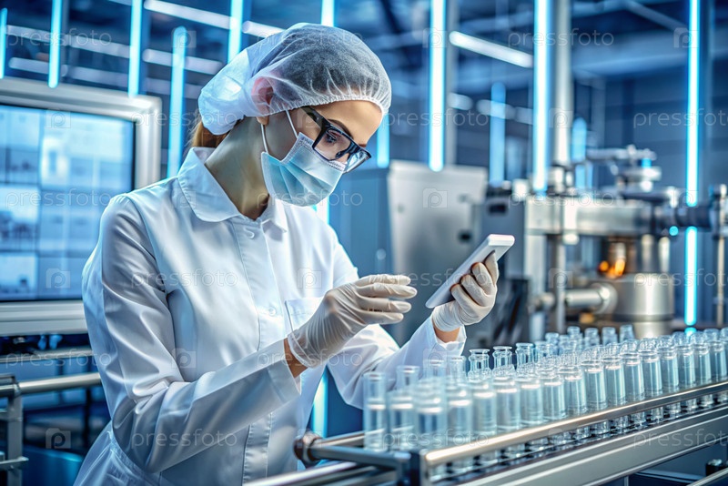 Производство лекарств: фармацевт тестирует медицинские флаконы на автоматическом трубопроводе фармацевтической производственной линии с использованием искусственного интеллекта