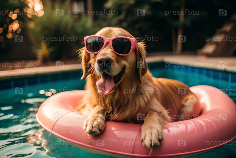 В бассейне плавает счастливый золотой ретривер в розовых очках на розовом надувном кольце.Концепция дружественного отдыха для домашних животных