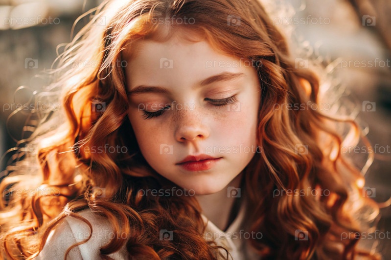 Портрет красивой маленькой рыжеволосой девочки с длинными волнистыми волосами и задумчивым взглядом.Власы развиваются и создают ощущение легкости и естественности