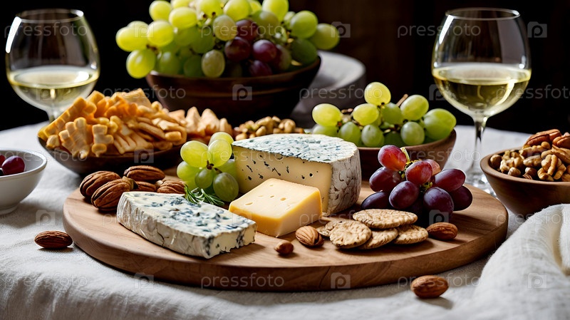 закуски для гостей. тарелка сыра. тарелка сыр с плесенью, орехи, виноград и бокал вина