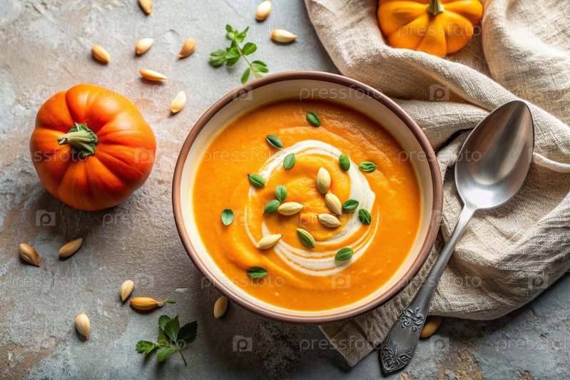 Традиционный мягкий тыквенно-кремовый суп с сливками и семьями тыквы на бежевом бетонном фоне