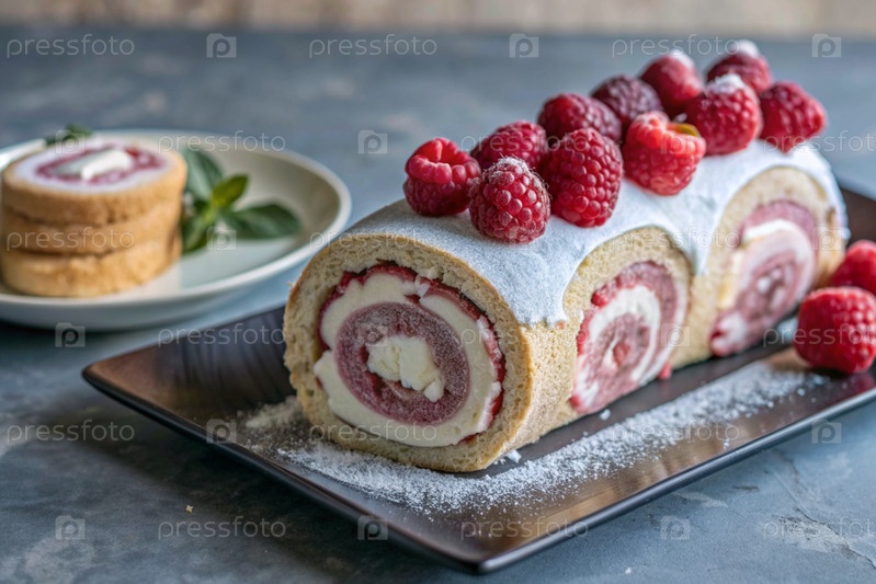 Швейцарская губка с малиной, вкусный фруктовый и сливочный десерт наполненный кремовым сыром, украшенный свежими малинами
