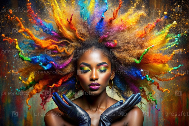 Творческий баннер для салона красоты или парикмахера. Модное профессиональное окрашивание волос. Красивая чернокожая афроамериканка с длинными многоцветными волосами. Взрыв цветов на голове