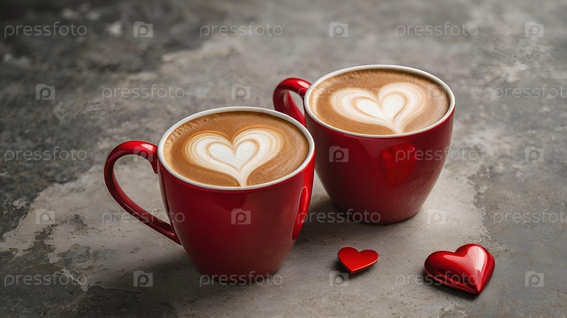Концепция Дня святого Валентина для кафе и ресторанов красные чашки кофе латте с сердцами вокруг горячие напитки для влюбленных