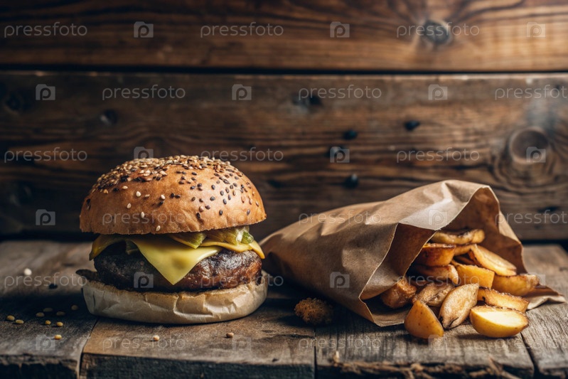 Фри, гамбургеры, свиные ребра на стильной доске на деревянном фоне. жареный картофель. концепция фаст-фуда, нездоровой еды и приготовления быстрого питания