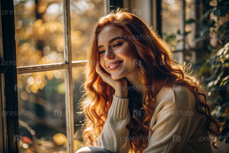Портрет красивой улыбающейся рыжеволосой девушки с кудрявыми волосами у окна, где светит теплое осеннее солнце