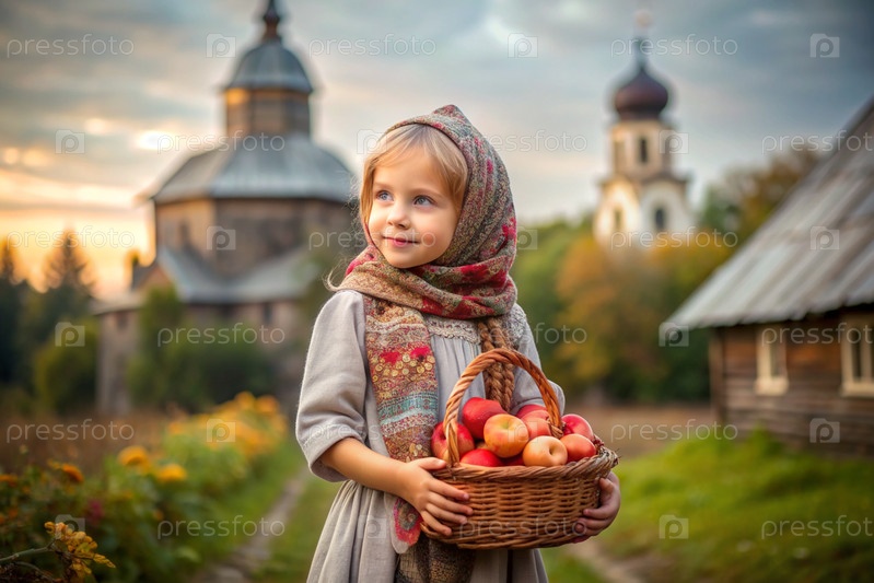 Концепция русского православного праздника Apple resort. Красивая девочка в российской национальной одежде и шарф с корзиной спелых красных яблок на фоне Православной церкви