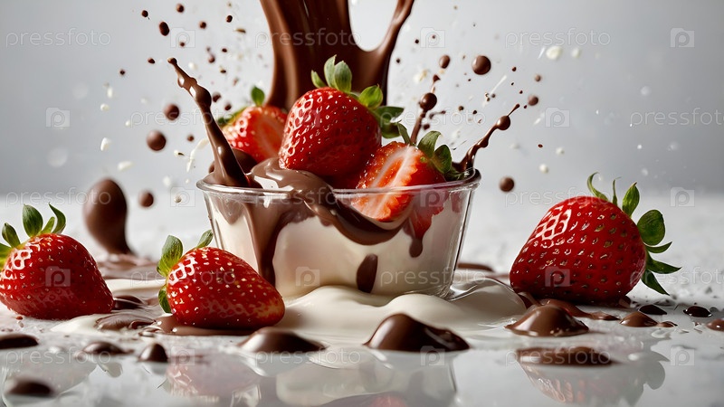 Творческий кулинарный рисунок. Близкие земляники с молоком и шоколадом, милкшейк, коктейль из йогурта с жидкими каплями