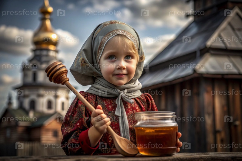 Концепция российского православного праздника 'Мед Спаситель' - красивая маленькая девочка в русской национальной одежде и шарф с баночкой меда на фоне православной церкви