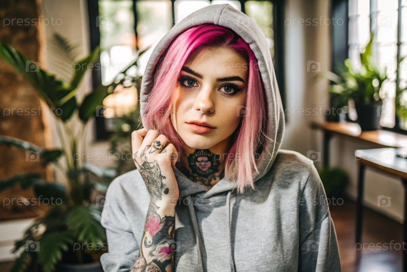 Портрет красивой хипстерской девушки с татуировками, пирсингами и розовыми волосами в серой майке