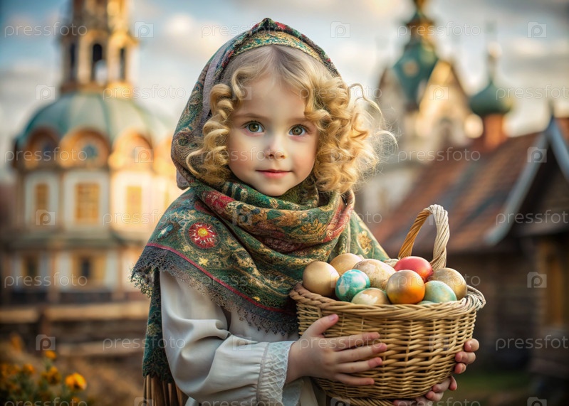 Счастливая Пасха. Христианство. Портрет трехлетней девочки в русском народном шале с плетеновой корзиной с пасхальными яйцами в руках на фоне православного храма