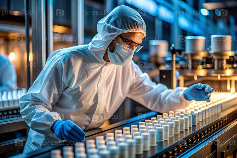Производство лекарств: фармацевт тестирует медицинские флаконы на автоматическом трубопроводе фармацевтической производственной линии с использованием искусственного интеллекта