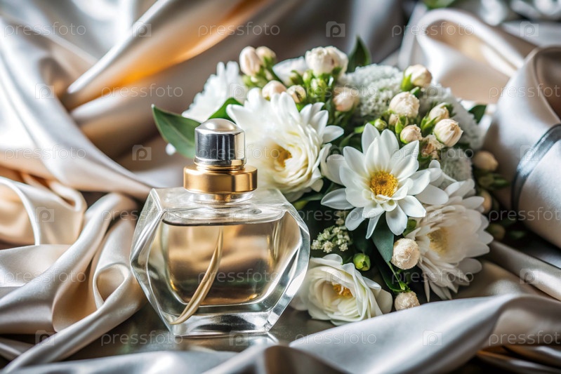 Минимальный фон для демонстрации продукта. Современная бутылка с парфюмом и букет цветов. Элегантный дизайн для презентации косметики и духов