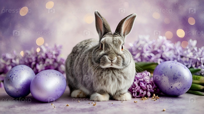 Нежные пасхальные яйца, серый кролик и фиолетовые цветы гиацинта на пастельном акварельном фоне с нежными венами