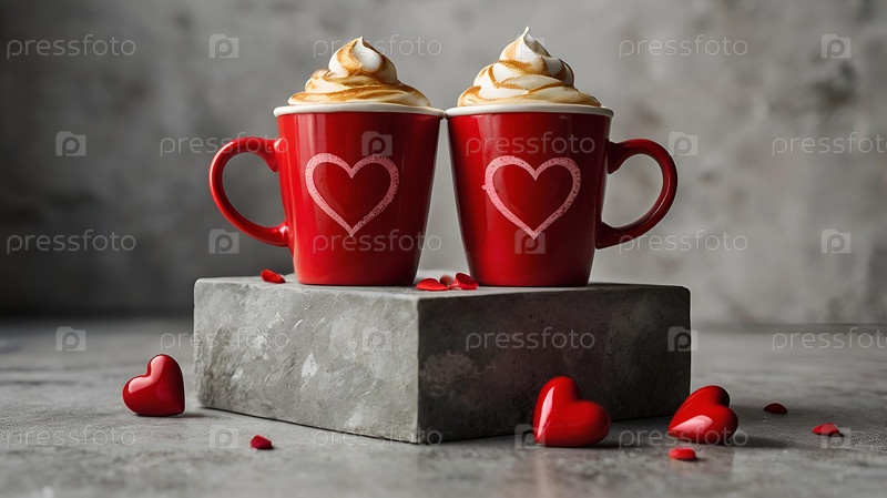 Концепция Дня святого Валентина для кафе и ресторанов красные чашки кофе латте с сердцами вокруг горячие напитки для влюбленных