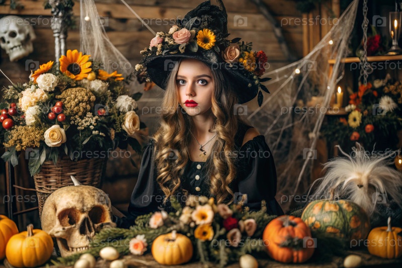 Концепция Хэллоуина. Ужасное. Костюмированная вечеринка. Красивая женщина в костюме ведьмы. Баннер, открытка