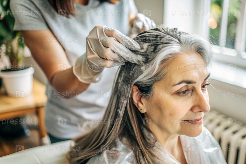 Женщина средних лет красит дома седые волосы.Женщина сидит во внутренней части комнаты.Дочь рисует маму
