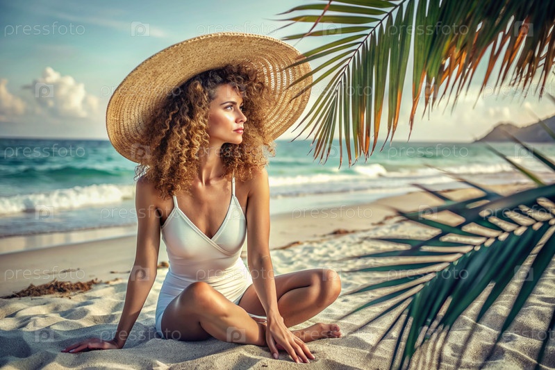 Женщина на отдыхе, сидящая в купальнике и соломенной шляпе с широкими краями на пляже в солнечный день и смотрящая на море