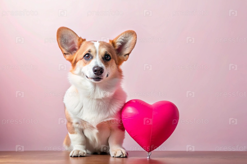 День святого Валентина. маленькое валлийское щенко корги с розовым сердцем. концепция любящих домашних животных