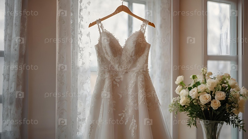 Близко. Элегантное белое свадебное платье на вешалке и букет цветов. Утро невесты. Аренда и покупка свадебных платьев для мероприятий