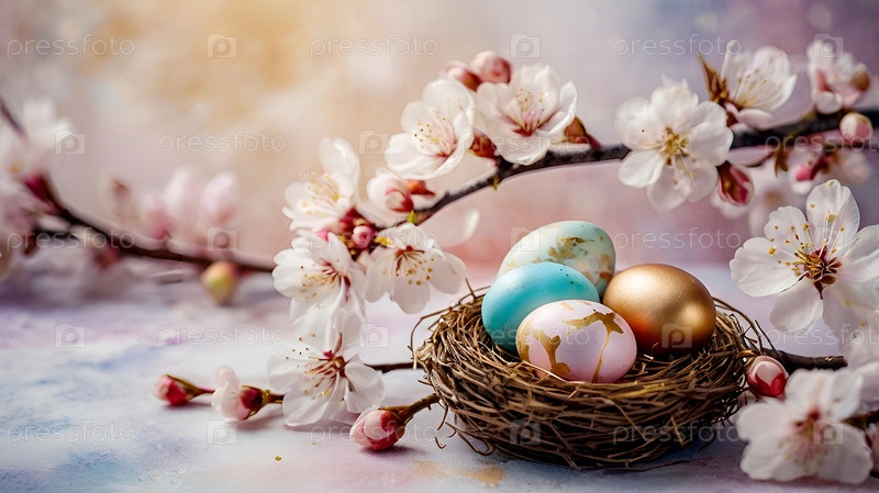 Нежные пасхальные яйца и вишневые ветви цветут на пастельном акварельном фоне с нежными полосками