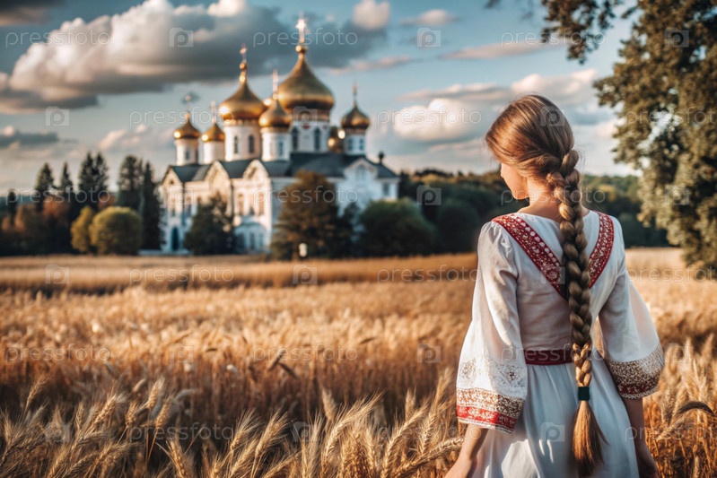Девушка в традиционном русском льняном наряде и с сковородой на голове на поле спелой золотистой пшеницы на фоне березы и православной церкви